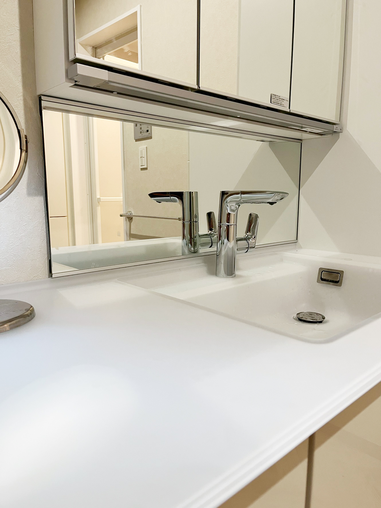 鏡・水栓下のカウンターは、洗面化粧台の天板と同じクリスタルカウンター。美しく高級感があって、N様のお気に入りです!