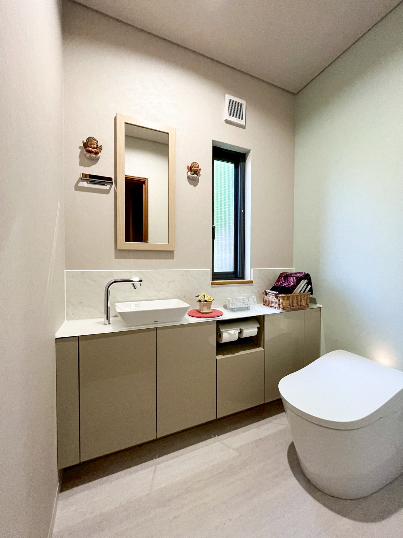 洗面所・浴室・トイレをまとめて見直すことで、使いやすさと空間の統一感を大切にしました。洗面のクリスタルカウンターは見た目の美しさだけでなく、お手入れのしやすさも魅力です。浴室は窓を小さくすることで外からの視線に配慮しつつ、ゆったりくつろげる空間に。トイレも落ち着いた雰囲気で、すっきりとした印象に仕上がりました。