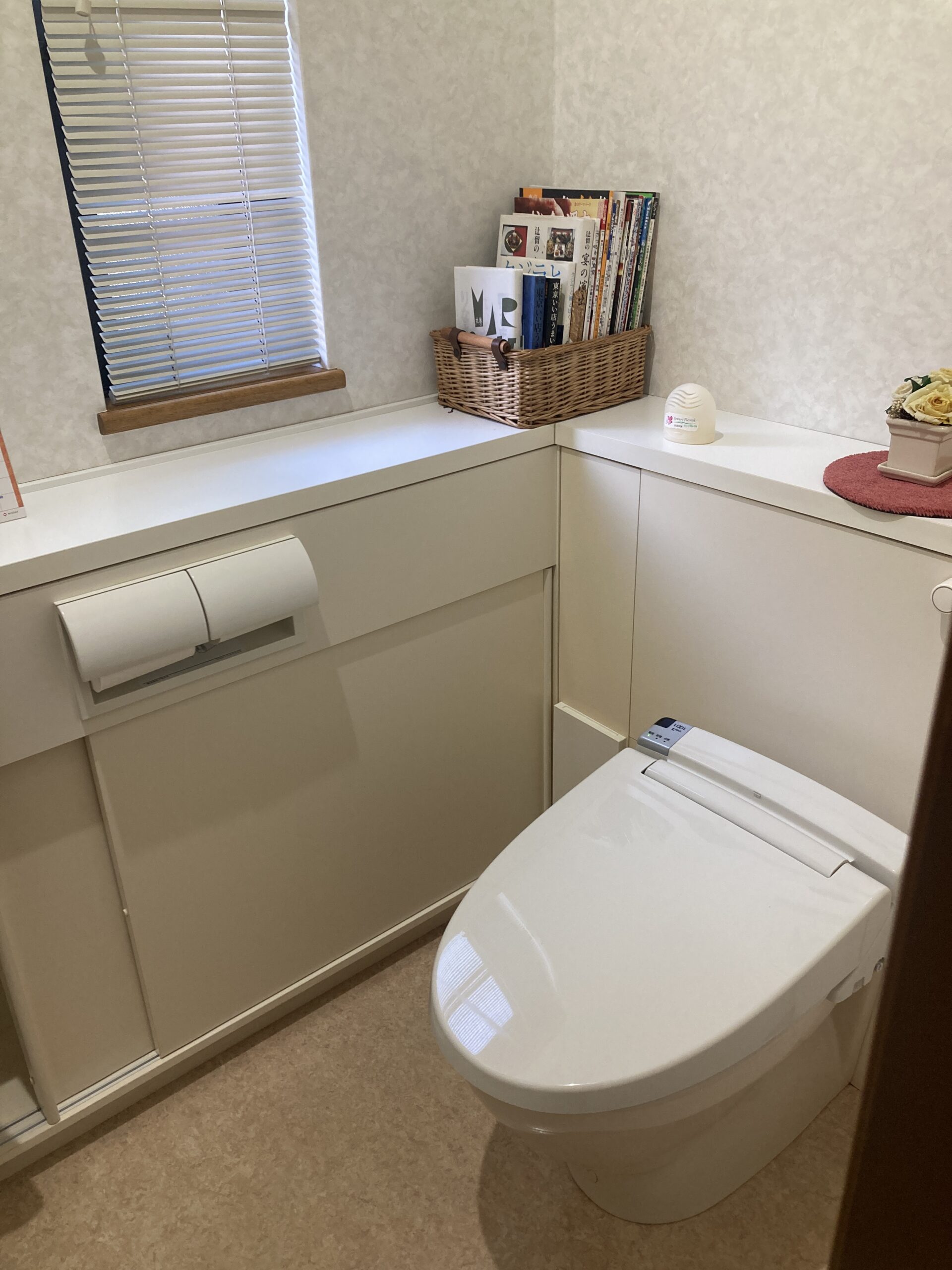 淡い色合いで統一された空間に、タンクレストイレがすっきりと収まり、上品で高級感のあるトイレに仕上がりました。