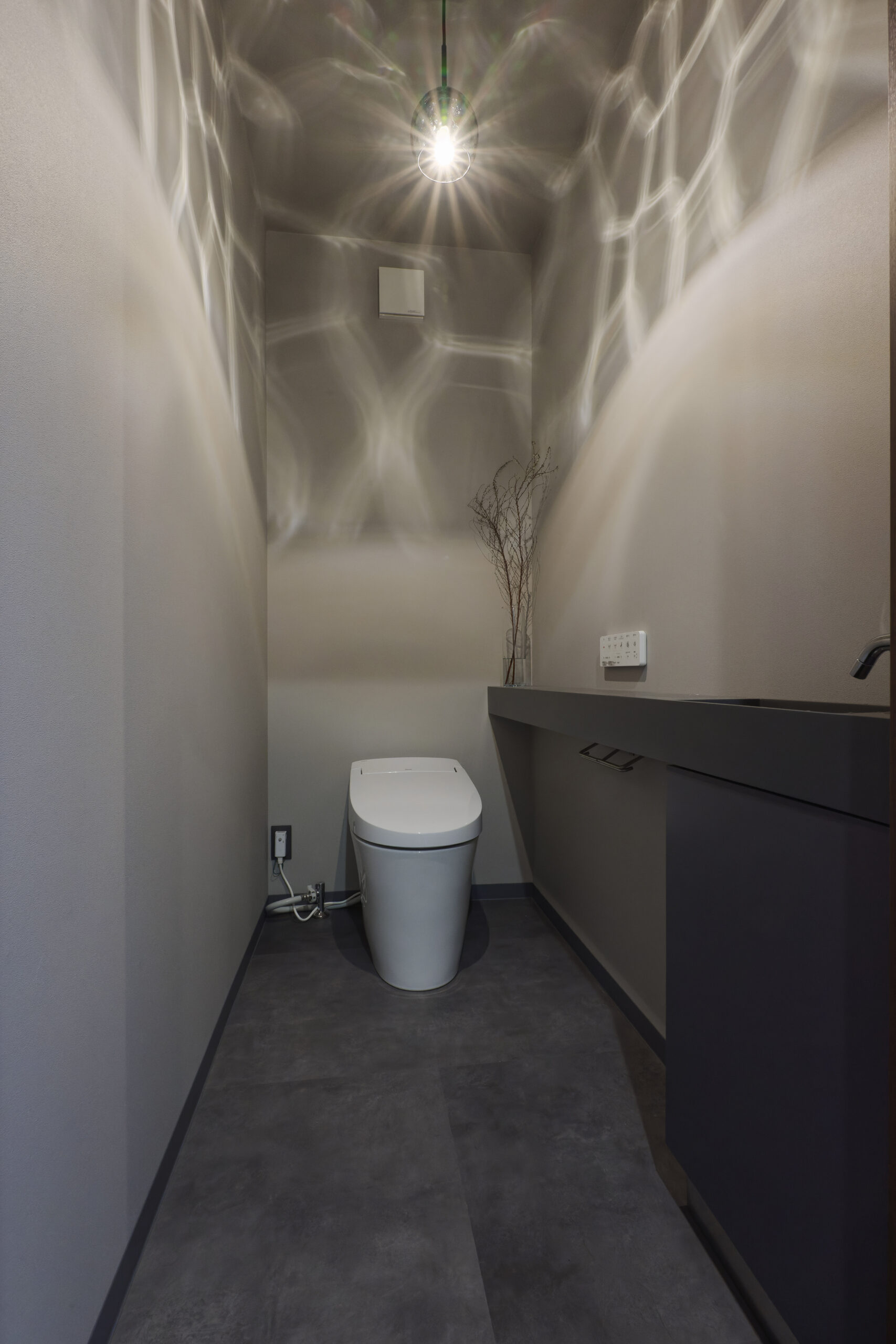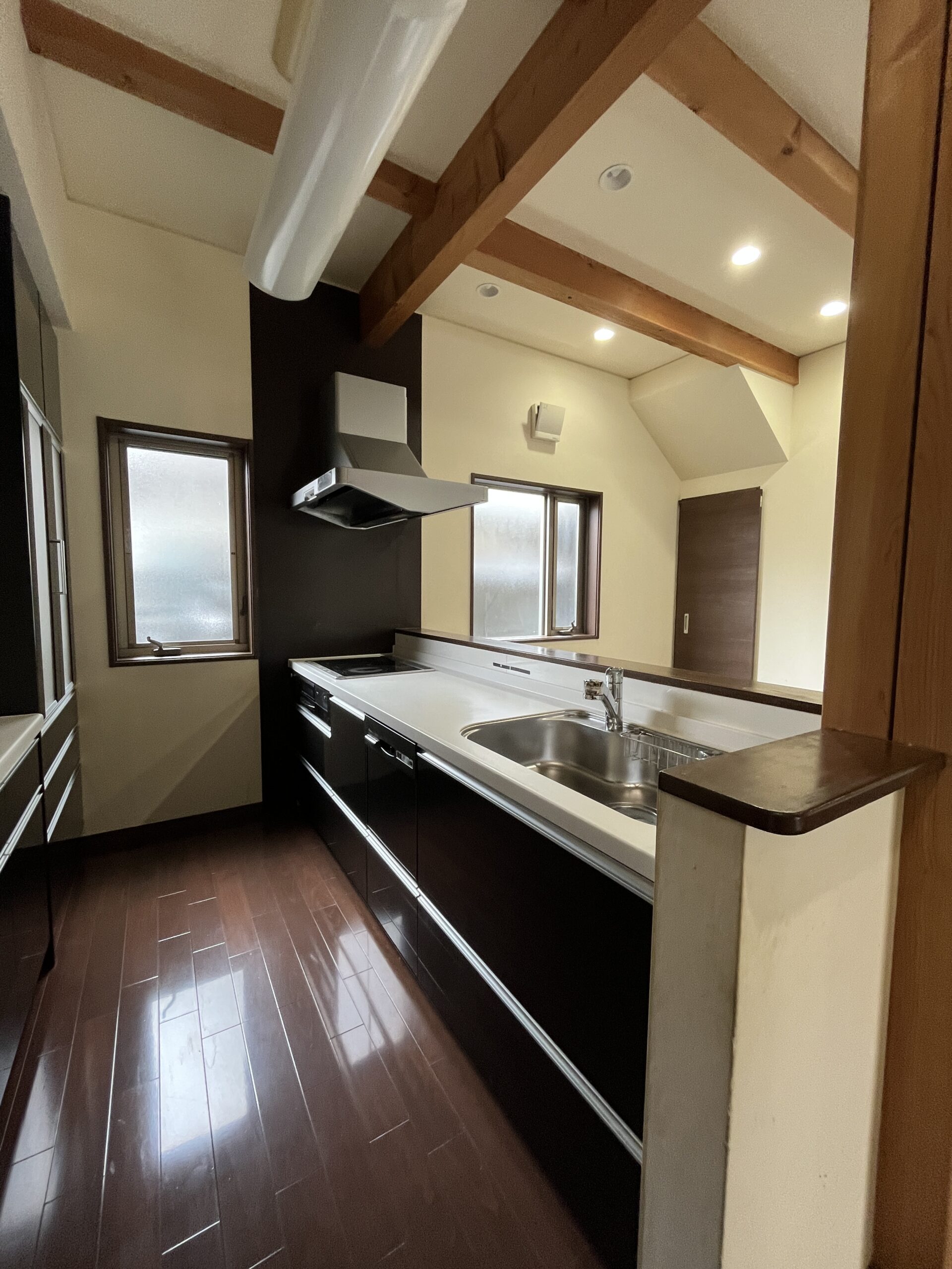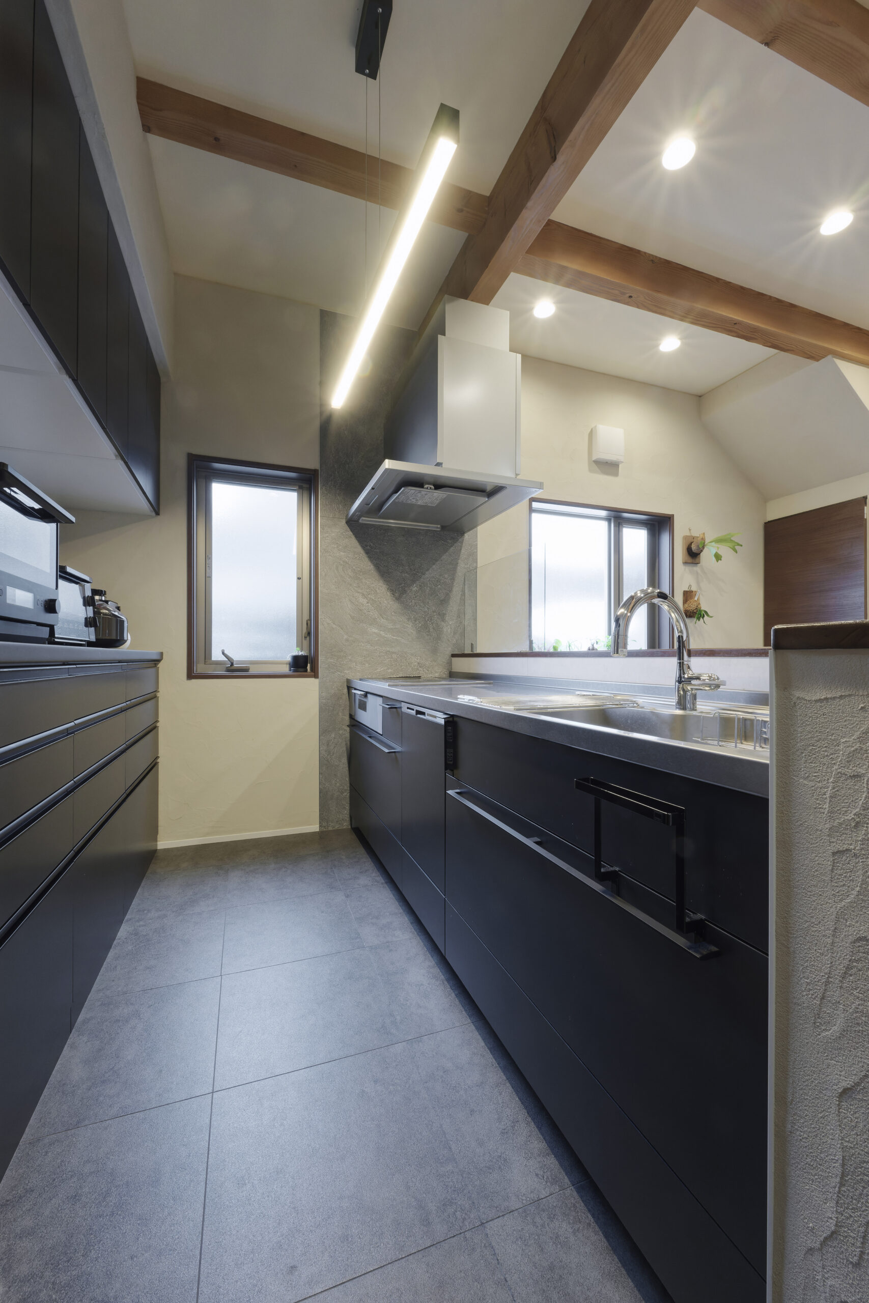 リフォームでは、「水まわりをきれいにしたい」というご要望を軸に、優先順位を整理しながら計画。グレーやブラックで統一した内装や、ステンレスヘアラインのキッチン天板、塗り壁仕上げなど、細部までこだわりを反映しました。