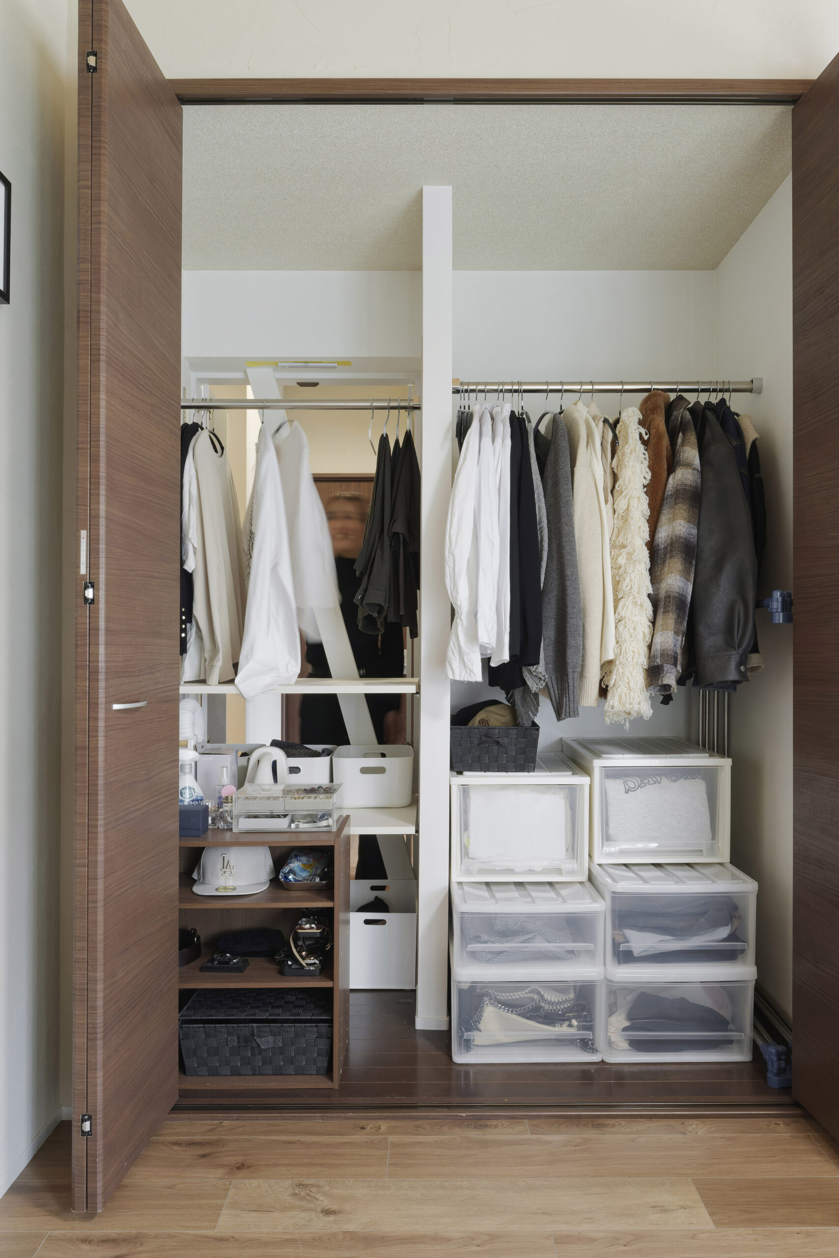 クローゼットの中も見直し、左半分は背面の壁に開き戸を設けることで、廊下側から上着などを取り出せる動線に。