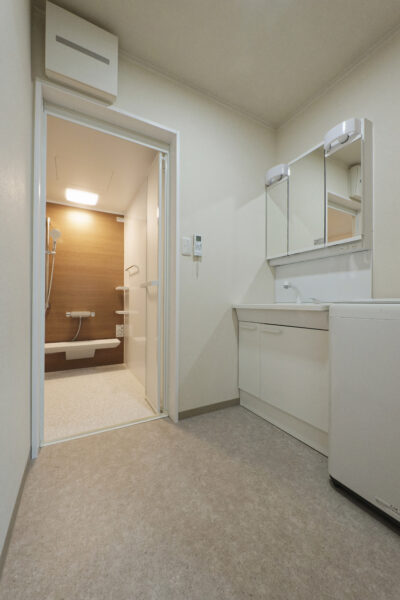 洗面化粧台を取り替えました。床のクッションフロア、壁(一面のみ)のクロスを貼り替え、おしゃれな洗面所になりました。
