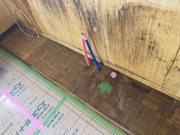 その後、新しいキッチンに合わせて給排水・給湯配管の仕込み工事を行いました。