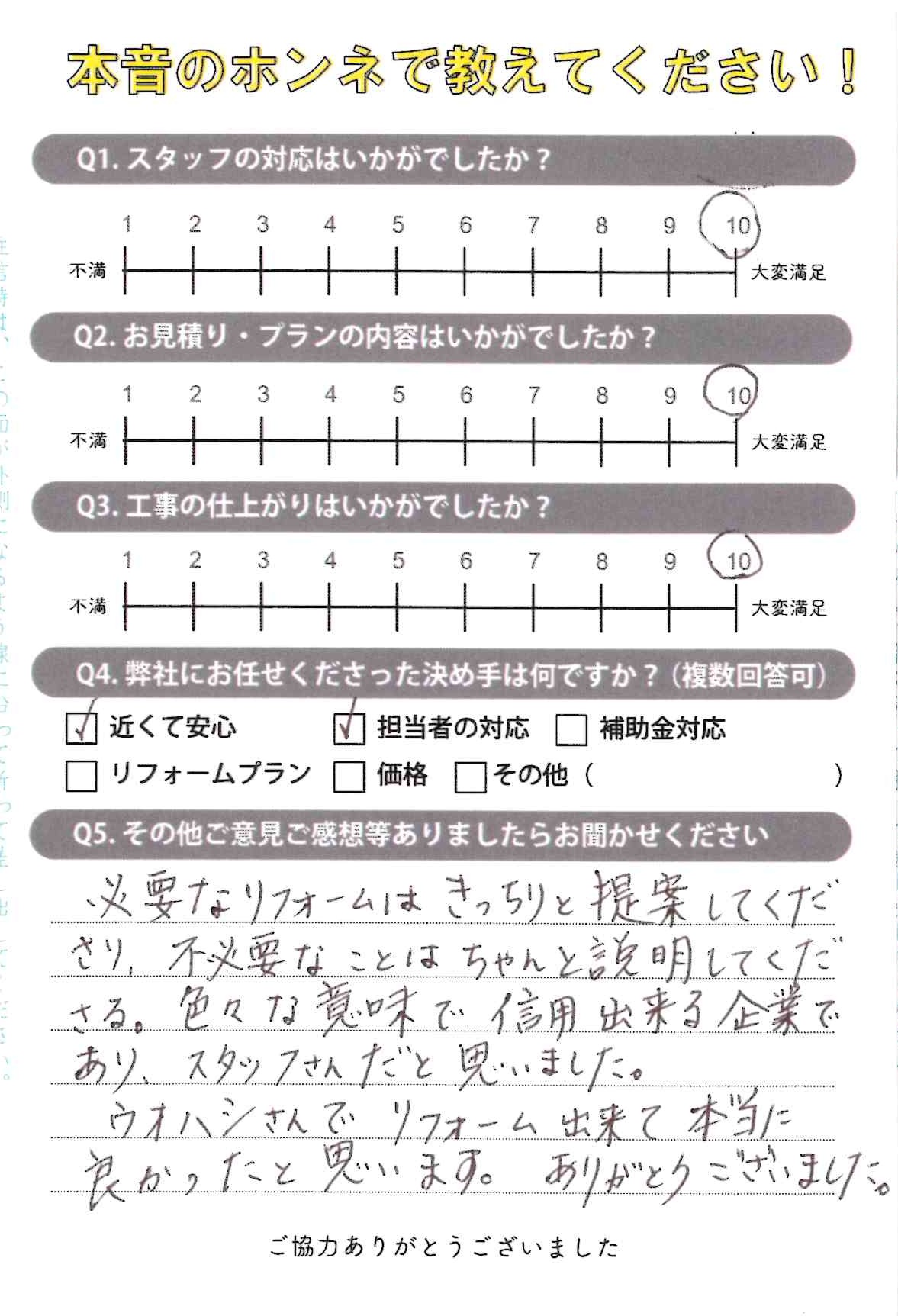 信用出来る企業であり、スタッフさん 加古川市O様(トイレ・コンロ取り替え) 2025年11月14日 お客様アンケート 加古川市O様(トイレ・コンロ取り替え) 必要なリフォームはきっちりと提案してくださり、不必要なことはちゃんと説明してくださる。 色々な意味で信用出来る企業であり、スタッフさんだと思いました。 ウオハシさんでリフォーム出来て本当に良かったと思います。ありがとうございました。 ありがとうございました!