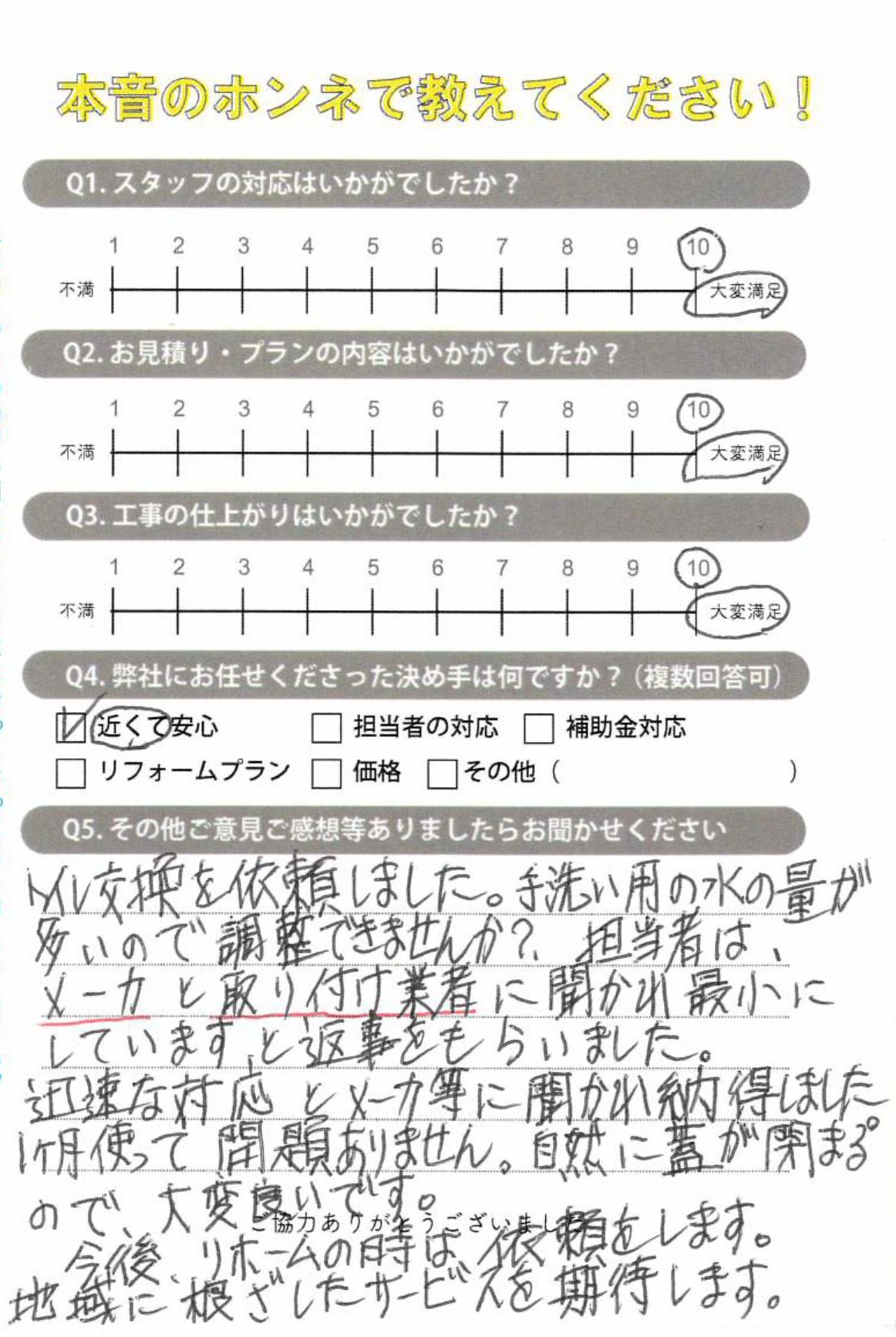 今後、リホームの時は依頼をします 高砂市H様(トイレリフォーム) 2026年04月08日 お客様アンケート トイレ交換を依頼しました。 手洗い用の水の量が多いので調整できませんか?担当者は、メーカーと取り付け業者に聞かれ最小にしています、と返事をもらいました。 迅速な対応とメーカー等に聞かれ納得しました。1か月使って問題ありません。 自然に蓋が閉まるので、大変良いです。 今後、リホームの時は依頼をします。 地域に根ざしたサービスを期待します。 ありがとうございました!